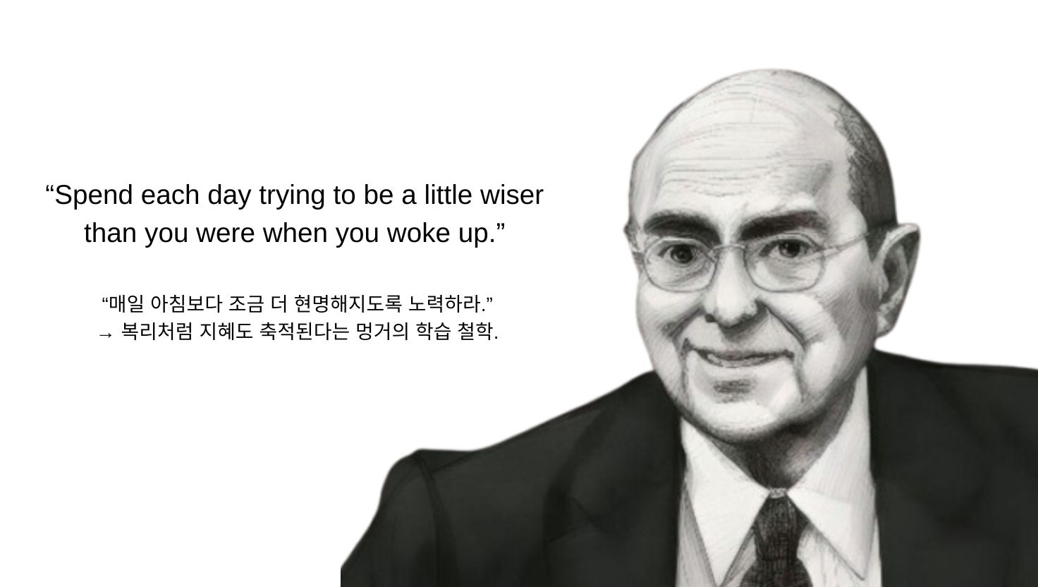 무엇보다 멍거는 도덕성과 정직함을 투자자의 핵심 자질로 보았습니다. 그는 정직하게 돈을 벌고, 절대 유혹에 굴복하지 않으며, 타인을 속이지 않는 것이 장기적인 성공을 위한 필수 조건이라고 여겼습니다. 그의 철학은 단순한 재테크의 기법이 아니라, 삶의 태도이자 성공적인 인생을 위한 지혜로 받아들여지고 있습니다. 그래서 찰리 멍거는 단지 훌륭한 투자자일 뿐 아니라, 깊이 있는 사고를 통해 인생 전반을 더 나은 방향으로 이끄는 현자(賢者)로 평가받고 있는 것입니다.