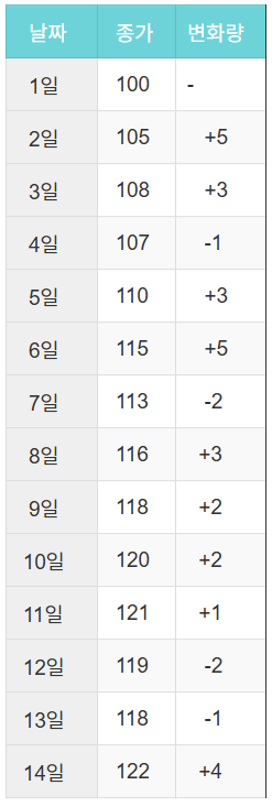 ▶ 평균 상승폭(Up Average) : (5 + 3 + 3 + 5 + 3 + 2 + 2 + 1 + 4) / 14 = 28 / 14 = 2